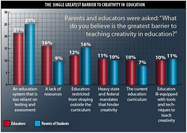 The survey identified several barriers that — as both teachers and parents agreed — stand in the way of creativity in American schools. Those included: