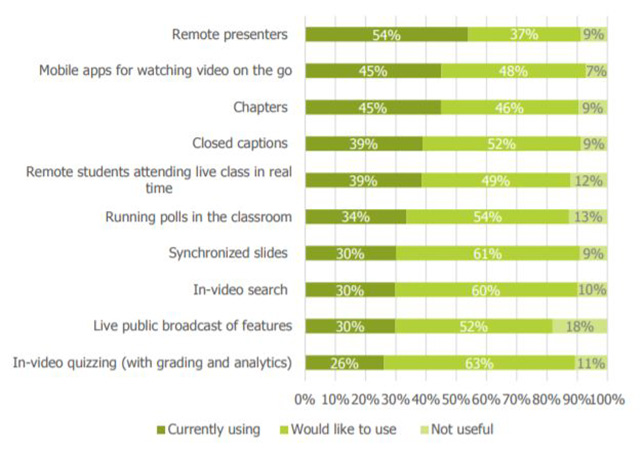 According to this year's results, the most popular "advanced feature" in use is for remote presentations. Fifty-four percent of respondents across all types of education organizations said that was in use in their schools. Nearly half (45 percent) reported the use of mobile apps for allowing viewers to watch video "on the go." A similar number reported using chapters to split lengthy videos into digestible segments. While closed captions have been picked up by just 39 percent of institutions, an additional 52 percent said they would like to implement them. Even more respondents would like to add synchronized slides (cited by 61 percent) and in-video search (60 percent). While in-video quizzing has been adopted by just a quarter (26 percent) of respondents, 63 percent would like to implement that feature.