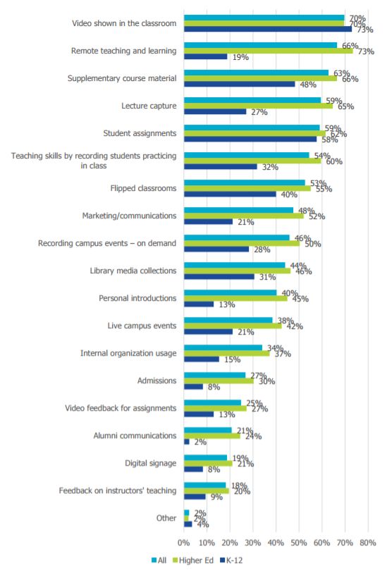 Video has become as ubiquitous in higher education classrooms as big screens in the fitness center and Hulu in residential halls. The use cases abound. The most popular use right now is to help with remote teaching and learning; 73 percent of institutions in a recent survey report the use of video for that purpose. That's followed by the showing of video in classrooms (70 percent), as supplementary course material (66 percent) and for lecture capture (65 percent). But video is also gaining steam in student assignments, teaching skills and recording students as they practice them, recording campus events for on-demand viewing, as part of library media collections, to deliver personal introductions and to give feedback on student assignments and instructor teaching practices.
